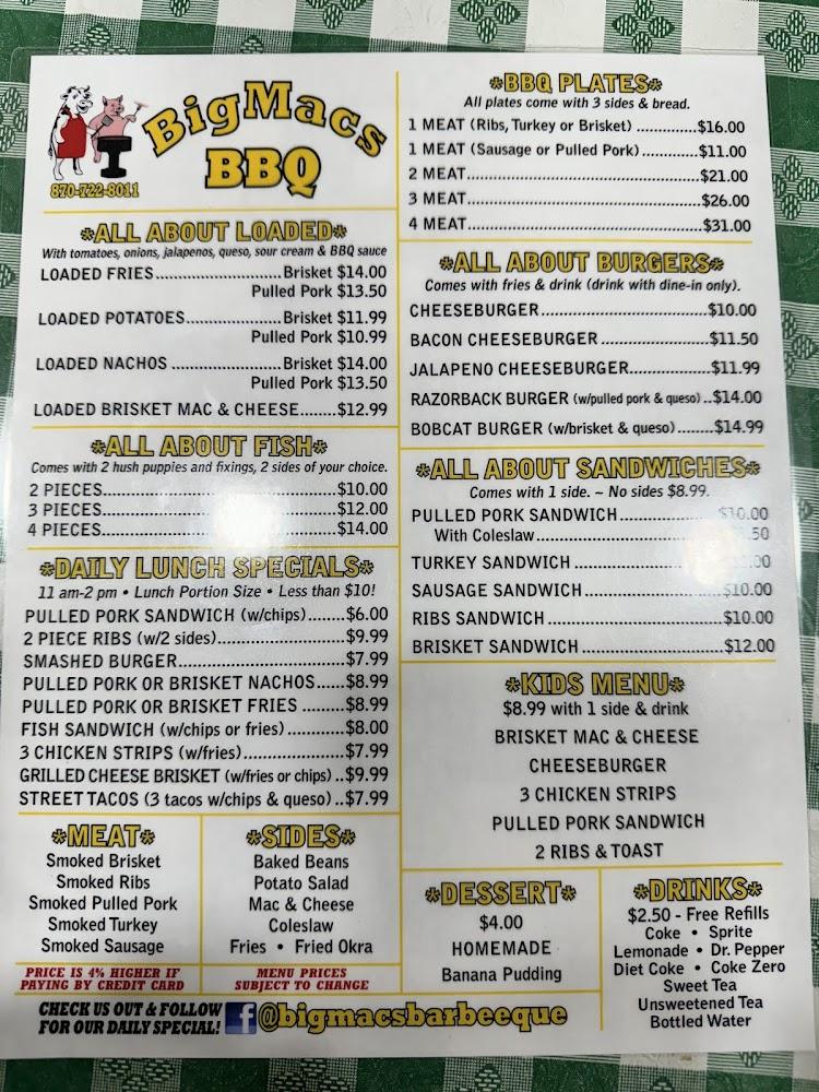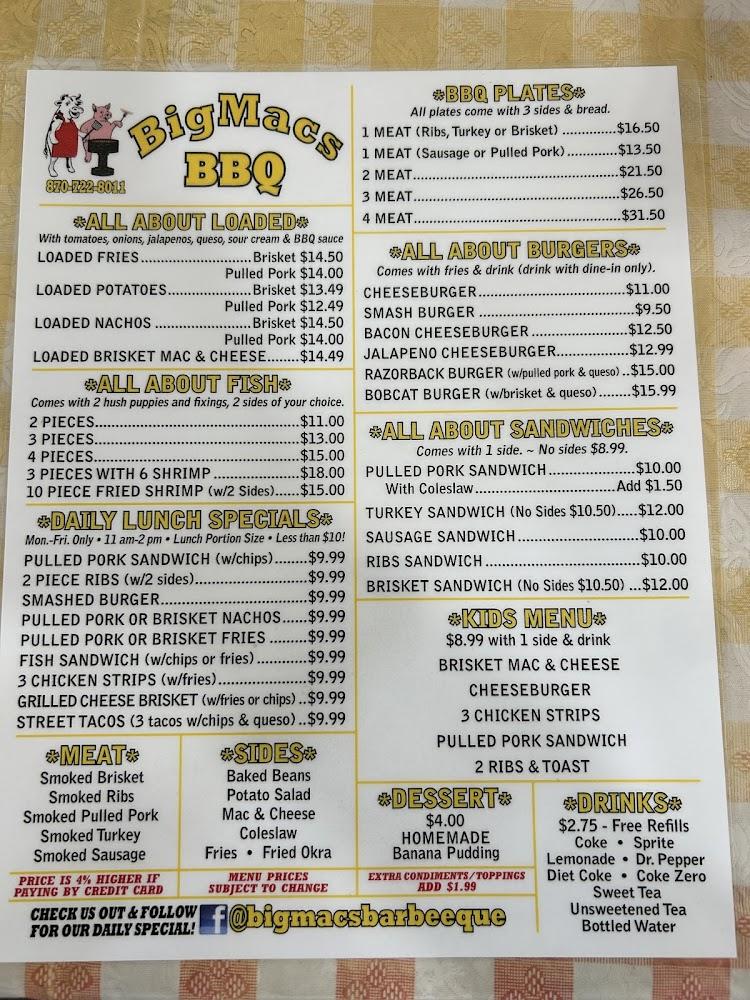 Welcome to BigMac's Barbeeque, your go-to BBQ joint in Hope, AR, proudly awarded the People's Choice for Best BBQ by Swark News. Here, we serve up authentic Texas-style, "low and slow" smoked brisket that melts in your mouth, alongside tender pulled pork and ribs that will leave you craving more. Enjoy our daily lunch specials and savor delicious US farm-raised fried catfish. With a friendly atmosphere, take advantage of our dine-in, takeout, and delivery options. Join us for a memorable meal at 2703 N Hazel St, and connect with us on Facebook and Instagram for the latest updates!