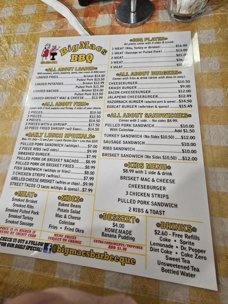 BigMac's Barbeeque offers a diverse menu that caters to all BBQ lovers. The standout items include smoked brisket, pulled pork, and a selection of ribs. Each dish is carefully prepared to ensure a satisfying meal. The daily specials provide variety for diners seeking something new.